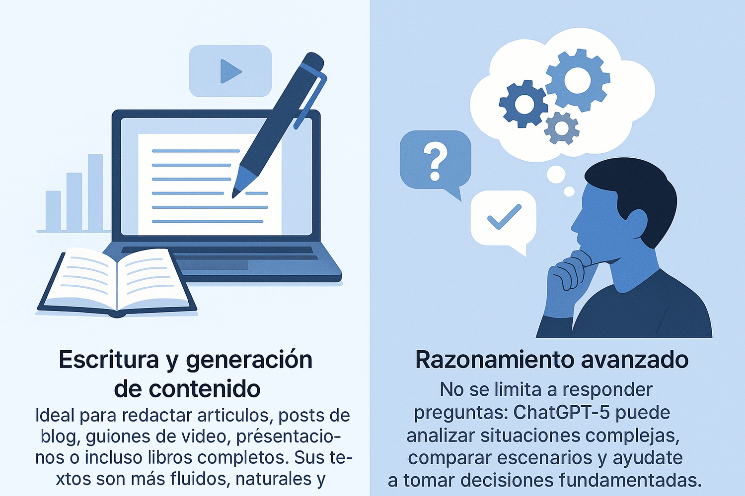 No se limita a responder preguntas: ChatGPT-5 puede analizar situaciones complejas, comparar escenarios y ayudarte a tomar decisiones fundamentadas.